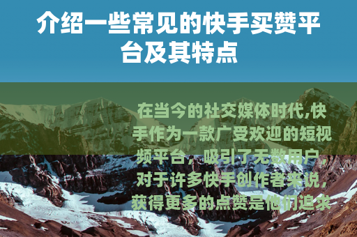 在当今的社交媒体时代,快手作为一款广受欢迎的短视频平台,吸引了无数用户,对于许多快手创作者来说,获得更多的点赞是他们追求的目标之一,这也促使了一些快手买赞平台的出现,以下将为您介绍10个这样的平台及其各自的特点。