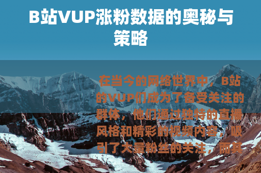 在当今的网络世界中,B站的VUP们成为了备受关注的群体,他们通过独特的直播风格和精彩的视频内容,吸引了大量粉丝的关注,而其中,涨粉数据无疑是衡量一个VUP成功与否的重要指标之一。