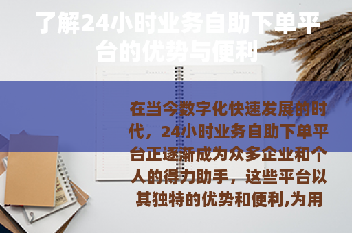 在当今数字化快速发展的时代,24小时业务自助下单平台正逐渐成为众多企业和个人的得力助手,这些平台以其独特的优势和便利,为用户提供了全新的业务处理体验。