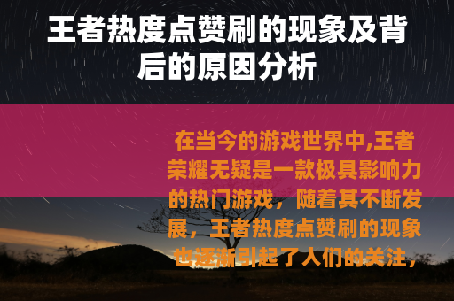 在当今的游戏世界中,王者荣耀无疑是一款极具影响力的热门游戏,随着其不断发展,王者热度点赞刷的现象也逐渐引起了人们的关注。