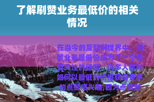 在当今的互联网世界中,刷赞业务最低价成为了一个备受关注的话题,许多人都对如何以最低的价格获得更多的点赞感兴趣,因为点赞数量在一定程度上代表着受欢迎程度和影响力。