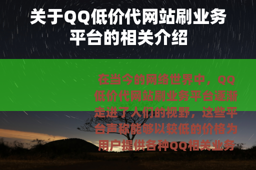 在当今的网络世界中,QQ低价代网站刷业务平台逐渐走进了人们的视野,这些平台声称能够以较低的价格为用户提供各种QQ相关业务的刷量服务,包括但不限于QQ空间的点赞量、访客量、说说转发量,QQ名片的赞数,以及QQ群的成员数量等。