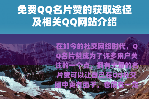 免费赞QQ名片赞的QQ网站为广大QQ用户提供了一个独特的社交体验平台,它们通过创新的运营模式和丰富的服务内容,满足了用户对于名片赞的需求,同时也为用户带来了更多的乐趣和社交机会,只要用户能够正确合理地使用这些网站,就可以在提升自己QQ名片人气的同时,享受社交网络带来的快乐。