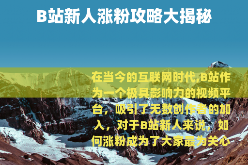 在当今的互联网时代,B站作为一个极具影响力的视频平台,吸引了无数创作者的加入,对于B站新人来说,如何涨粉成为了大家最为关心的问题之一,以下是一些实用的方法,帮助B站新人在平台上快速积累粉丝。 是关键,新人要明确自己的定位和擅长的领域,创作具有特色和价值的视频内容,无论是搞笑、美食、游戏、知识科普还是其他类型,都要确保视频能够吸引目标受众的眼球,如果你擅长烹饪,那么可以制作详细的美食制作教程,分享独特的食谱和烹饪技巧,让观众在观看你的视频后能够有所收获,这样他们就更有可能关注你,期待你的下一次更新。
