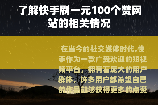 在当今的社交媒体时代,快手作为一款广受欢迎的短视频平台,拥有着庞大的用户群体,许多用户都希望自己的作品能够获得更多的点赞,从而提高曝光度和人气,在这样的需求下,一些声称可以提供快手刷赞服务的网站应运而生,其中就有那种号称一元能刷100个赞的网站。