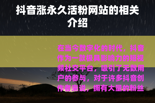 在当今数字化的时代,抖音作为一款极具影响力的短视频社交平台,吸引了无数用户的参与,对于许多抖音创作者来说,拥有大量的粉丝是他们追求的目标之一,因为粉丝数量在一定程度上代表着影响力和受欢迎程度,在这样的背景下,抖音涨永久活粉网站应运而生。