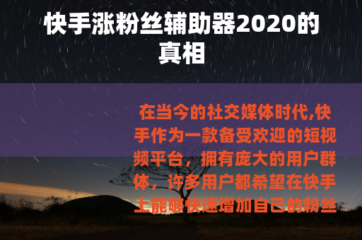 在当今的社交媒体时代,快手作为一款备受欢迎的短视频平台,拥有庞大的用户群体,许多用户都希望在快手上能够快速增加自己的粉丝数量,从而获得更多的关注和影响力,而快手涨粉丝辅助器2020在这样的背景下应运而生。