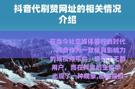 在当今社交媒体盛行的时代,抖音作为一款极具影响力的短视频平台,吸引了无数用户,而在抖音的生态中,出现了一种现象,那就是抖音代刷赞网址的存在。