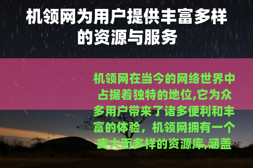 机领网在网络资源领域的不断探索和创新,为用户带来了全新的体验和价值,它以其独特的优势和魅力,吸引着越来越多的用户加入其中,共同构建一个充满活力和创造力的网络世界,在未来的发展中,机领网将继续秉持着用户至上的原则,不断优化和完善自身的服务,为用户提供更加优质、便捷、个性化的网络资源和服务,成为网络世界中一颗璀璨的明珠,为网络行业的发展注入新的活力和动力,引领网络资源平台走向新的高度,为用户创造更多的美好回忆和价值,无论是在资源整合、用户体验还是社会责任方面,机领网都将不断努力,为用户和社会带来更多的积极影响,成为网络时代不可或缺的一部分。
