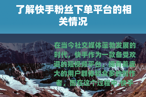在当今社交媒体蓬勃发展的时代,快手作为一款备受欢迎的短视频平台,拥有着庞大的用户群体和众多的创作者,而在这个过程中,快手粉丝下单平台也逐渐进入了人们的视野。