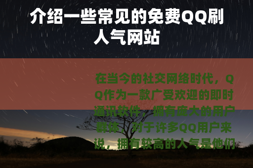 在当今的社交网络时代,QQ作为一款广受欢迎的即时通讯软件,拥有庞大的用户群体,对于许多QQ用户来说,拥有较高的人气是他们所期望的,这不仅可以让自己的空间或账号更受关注,也能在一定程度上满足自己的社交需求,不少人会去寻找一些免费的QQ刷人气网站。