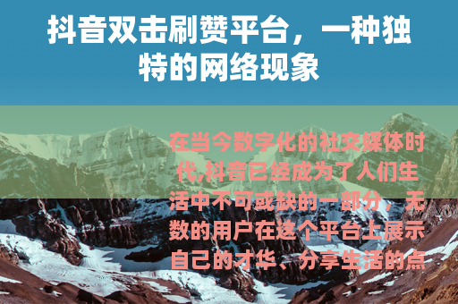 在当今数字化的社交媒体时代,抖音已经成为了人们生活中不可或缺的一部分,无数的用户在这个平台上展示自己的才华、分享生活的点滴,希望能够获得更多的关注和点赞,而在这个过程中,抖音双击刷赞平台也应运而生,成为了一个备受关注的话题。