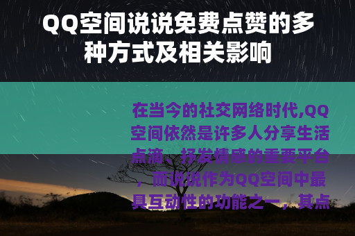 QQ空间说说免费点赞是一个具有两面性的现象,它既为用户提供了一种增加说说热度、满足社交需求的途径,又可能引发一些诸如内容质量下降、过度依赖等问题,但只要我们能够正确地认识和利用它,就可以在享受免费点赞带来的好处的同时,保持QQ空间社交的健康和活力,让这个平台继续成为我们展示自我、交流情感、分享生活的美好空间,我们应该在追求点赞数量的同时,更加注重说说内容的质量和社交关系的维护,以积极的态度和正确的方法,在QQ空间中创造出更加丰富和有意义的社交体验。