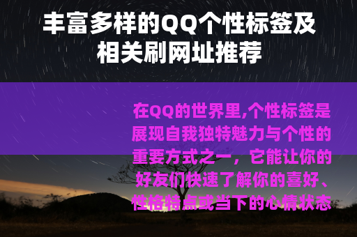 为大家介绍一些可以找到更多QQ个性标签的刷网址,这些网址上有着海量的个性标签资源,无论是你想要的哪种风格,都能在上面找到满意的答案,其中一个网址是[具体网址1],它的界面设计简洁明了,分类十分细致,你可以通过搜索关键词,快速找到你想要的个性标签,这个网址还会定期更新,保证你能获取到最新最潮流的个性标签,还有[具体网址2],它不仅有丰富的个性标签,还提供了一些个性化的设置建议,帮助你更好地搭配个性标签,让你的QQ展示更加完美,[具体网址3]也是一个不错的选择,它上面有很多用户分享自己创作的个性标签,你可以从中汲取灵感,也可以将自己的得意之作分享上去,与其他用户交流互动。