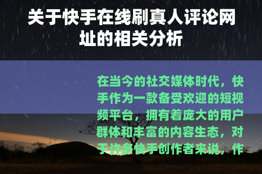 快手在线刷真人评论网址在网络上的出现,引发了不少人的关注,这些网址声称能够为用户提供真实的评论,从而帮助用户提升作品的热度和关注度,从表面上看,这似乎是一种快速提升作品影响力的有效途径,我们需要深入了解其背后的原理和可能带来的影响。