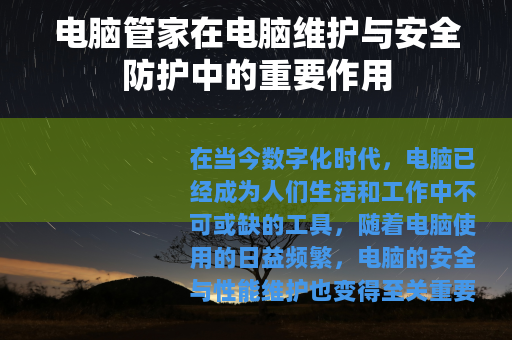 在当今数字化时代,电脑已经成为人们生活和工作中不可或缺的工具,随着电脑使用的日益频繁,电脑的安全与性能维护也变得至关重要,而电脑管家在其中扮演着举足轻重的角色。