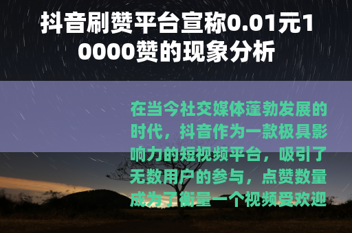 在当今社交媒体蓬勃发展的时代,抖音作为一款极具影响力的短视频平台,吸引了无数用户的参与,点赞数量成为了衡量一个视频受欢迎程度的重要指标之一,而最近,一种声称抖音刷赞平台0.01元10000赞的现象引起了广泛关注。