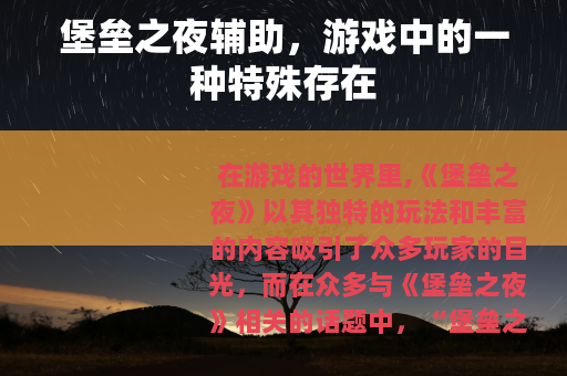 在游戏的世界里,《堡垒之夜》以其独特的玩法和丰富的内容吸引了众多玩家的目光,而在众多与《堡垒之夜》相关的话题中,“堡垒之夜辅助”也成为了一个被不少玩家所关注的方面。