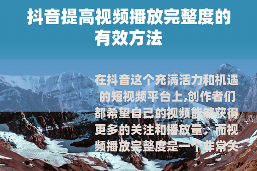 在抖音这个充满活力和机遇的短视频平台上,创作者们都希望自己的视频能够获得更多的关注和播放量,而视频播放完整度是一个非常关键的指标,如何提高抖音视频的播放完整度呢?以下是一些实用的方法。 的吸引力至关重要,要确保视频的开头能够迅速抓住用户的眼球,可以通过设置一个有趣的悬念、提出一个引人深思的问题或者展示一个令人惊叹的场景等方式,激发用户的好奇心,让他们想要继续看下去,在美食视频的开头,可以展示一道精美的成品菜肴,然后再逐步介绍制作过程,这样用户就会更有兴趣观看完整视频,了解这道美食是如何制作出来的。