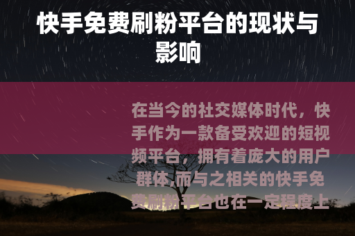快手免费刷粉平台在当前的社交媒体环境中是一个具有一定影响力的现象,它既为用户提供了一种看似快速提升粉丝数量的途径,但同时也带来了一系列的问题和风险,用户在面对这类平台时,应该保持理性和清醒的头脑,权衡利弊,选择更加健康、可持续的发展方式,在快手平台上真正实现自己的梦想和价值,通过努力和真诚去赢得粉丝的喜爱和支持,而不是依赖于刷粉等不正当手段来获取虚假的繁荣,才能在快手这个充满机遇和挑战的平台上走得更远,创造出更多有意义的内容,为自己和社会带来更大的价值。 能满足你的需求,你可以根据实际情况进行调整和修改,需要注意的是,刷粉等行为违反了平台规定,不建议在实际操作中使用此类平台。