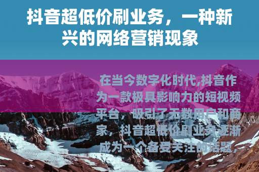 在当今数字化时代,抖音作为一款极具影响力的短视频平台,吸引了无数用户和商家,抖音超低价刷业务逐渐成为一个备受关注的话题。