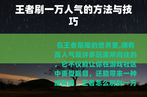 在王者荣耀的世界里,拥有高人气是许多玩家所向往的,它不仅能让你在游戏社区中更受瞩目,还能带来一种成就感,王者怎么刷到一万人气呢?以下是一些可行的方法和技巧。