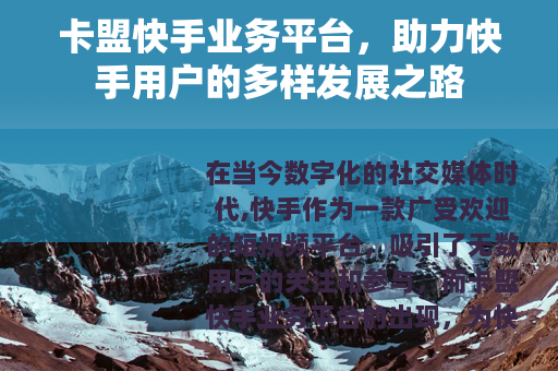 在当今数字化的社交媒体时代,快手作为一款广受欢迎的短视频平台,吸引了无数用户的关注和参与,而卡盟快手业务平台的出现,为快手用户提供了更多拓展自身业务和提升影响力的机会。