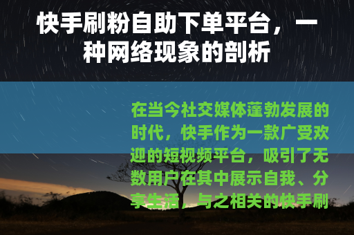 在当今社交媒体蓬勃发展的时代,快手作为一款广受欢迎的短视频平台,吸引了无数用户在其中展示自我、分享生活,与之相关的快手刷粉自助下单平台也悄然兴起,成为了一个备受关注的话题。