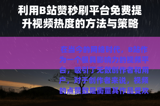 在当今的网络时代,B站作为一个极具影响力的视频平台,吸引了无数创作者和用户,对于创作者来说,视频的点赞数是衡量其作品受欢迎程度的重要指标之一,而现在市面上出现了一些B站赞秒刷平台免费的服务,这为创作者们提供了一种新的途径来提升自己作品的热度。