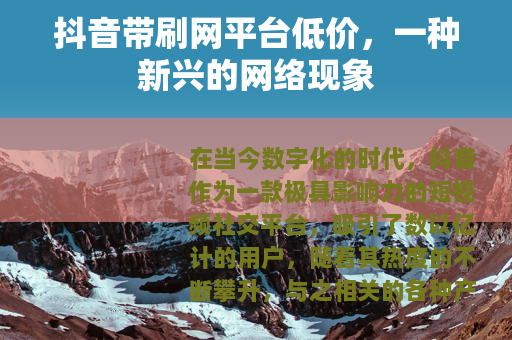 在当今数字化的时代,抖音作为一款极具影响力的短视频社交平台,吸引了数以亿计的用户,随着其热度的不断攀升,与之相关的各种产业也应运而生,其中抖音带刷网平台低价服务就是近年来备受关注的一种现象。
