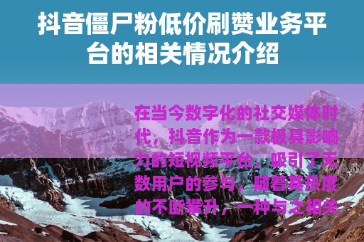 在当今数字化的社交媒体时代,抖音作为一款极具影响力的短视频平台,吸引了无数用户的参与,随着其热度的不断攀升,一种与之相关的现象也逐渐进入人们的视野,那就是抖音僵尸粉低价刷赞业务平台。