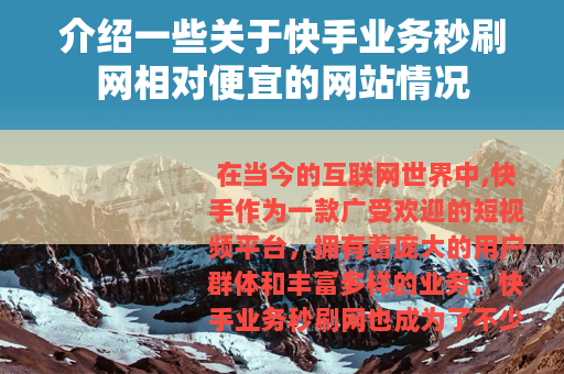 在当今的互联网世界中,快手作为一款广受欢迎的短视频平台,拥有着庞大的用户群体和丰富多样的业务,快手业务秒刷网也成为了不少人关注的焦点,尤其是那些希望以较低成本提升自己在快手上相关数据的用户,对于最便宜的网站更是有着浓厚的兴趣。