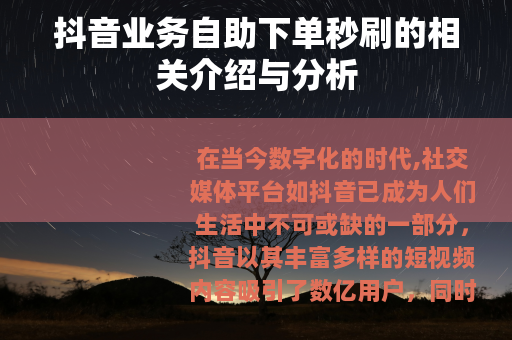 在当今数字化的时代,社交媒体平台如抖音已成为人们生活中不可或缺的一部分,抖音以其丰富多样的短视频内容吸引了数亿用户,同时也催生了一系列与之相关的业务,其中抖音业务自助下单秒刷便是一种备受关注的现象。