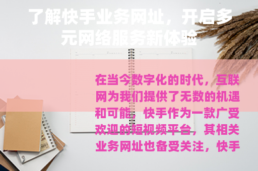 在当今数字化的时代,互联网为我们提供了无数的机遇和可能,快手作为一款广受欢迎的短视频平台,其相关业务网址也备受关注,快手业务网址涵盖了众多领域,为用户和创作者带来了丰富的体验和发展空间。