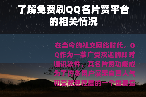 在当今的社交网络时代,QQ作为一款广受欢迎的即时通讯软件,其名片赞功能成为了许多用户展示自己人气和受欢迎程度的一个重要指标,免费刷QQ名片赞平台应运而生,吸引了众多QQ用户的关注。