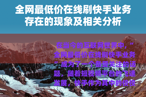 在当今的互联网世界中,“全网最低价在线刷快手业务”成为了一个备受关注的话题,随着短视频平台的飞速发展,快手作为其中的佼佼者,拥有着庞大的用户群体和极高的活跃度,而与之相关的刷业务现象也应运而生,全网最低价在线刷快手业务更是吸引了众多人的目光。