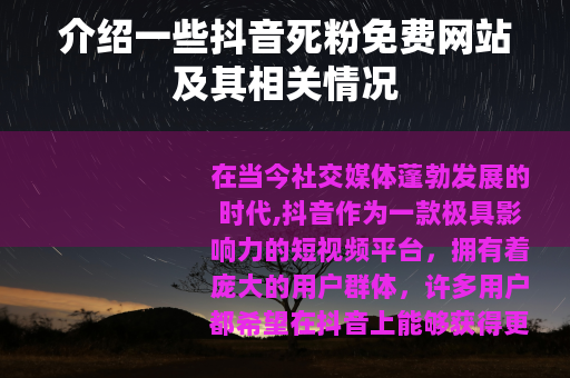 抖音死粉免费网站是一个在抖音生态中存在的现象,用户在面对这些网站时,要根据自己的实际需求和目标,权衡利弊后再决定是否使用,也要明白,在抖音上取得成功的关键还是在于不断提升自己的创作能力,提供有价值的内容,吸引真正的粉丝,这样才能在这个充满机遇和挑战的平台上实现自己的价值和目标,获得长期的发展和进步。 能满足您的需求,您可以根据实际情况进行调整和修改,需要注意的是,使用非正规途径获取粉丝可能违反抖音平台的相关规定,在实际操作中请谨慎对待。