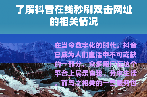 在当今数字化的时代,抖音已成为人们生活中不可或缺的一部分,众多用户在这个平台上展示自我、分享生活,而与之相关的一些服务也应运而生,其中就包括抖音在线秒刷双击网址。