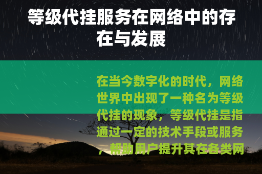 等级代挂服务在网络世界中已经成为一种不可忽视的现象,它既有满足用户需求、促进市场发展的积极一面,也存在着一些风险和问题,只有通过各方的共同努力,才能使其在合法合规的轨道上健康发展,为用户和市场带来更多的价值,在未来,随着网络技术的不断进步和用户需求的变化,等级代挂服务也将不断演变和完善,以适应新的形势和挑战,我们期待着它能够在规范发展的道路上,为网络世界增添更多的活力和色彩。