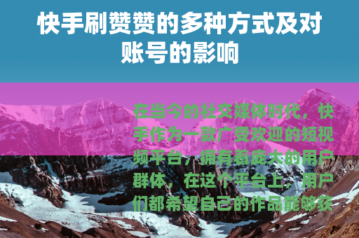 在当今的社交媒体时代,快手作为一款广受欢迎的短视频平台,拥有着庞大的用户群体,在这个平台上,用户们都希望自己的作品能够获得更多的点赞,从而获得更多的关注和流量,而快手刷赞赞也因此成为了一个热门的话题。