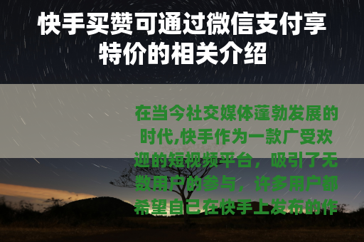 在当今社交媒体蓬勃发展的时代,快手作为一款广受欢迎的短视频平台,吸引了无数用户的参与,许多用户都希望自己在快手上发布的作品能够获得更多的点赞,以增加作品的热度和影响力,而现在,有一种方式可以让用户通过微信支付享受到快手买赞的特价优惠。