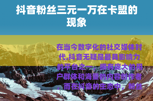 在一些网络角落,出现了所谓“抖音粉丝三元一万卡盟”的情况,卡盟,这个相对小众但在特定圈子里有一定知晓度的平台,成为了一些人获取抖音粉丝的途径,这些卡盟声称能够以极低的价格,比如三元一万的价格为抖音账号提供大量粉丝。