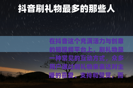 在抖音这个充满活力与创意的短视频平台上,刷礼物是一种常见的互动方式,众多用户通过刷礼物来表达对主播的喜爱、支持和赞赏,而在这其中,有一些人因其刷礼物的慷慨程度而备受瞩目,他们成为了抖音刷礼物最多的群体。