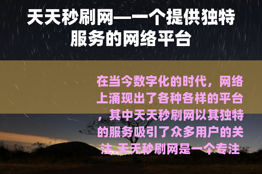 在当今数字化的时代,网络上涌现出了各种各样的平台,其中天天秒刷网以其独特的服务吸引了众多用户的关注,天天秒刷网是一个专注于为用户提供便捷快速服务的网络站点。