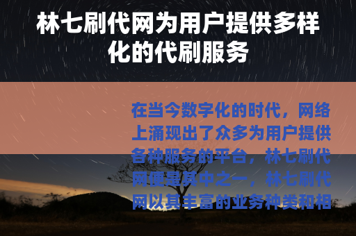林七刷代网在网络服务领域中占据着一席之地,它以其多样化的业务、便捷的操作和良好的用户体验,为广大用户提供了一种提升网络影响力和实现自身目标的途径,在使用林七刷代网或其他类似平台的服务时,用户也需要根据自身的实际情况和需求,合理选择和使用,以确保能够获得最大的收益和价值。