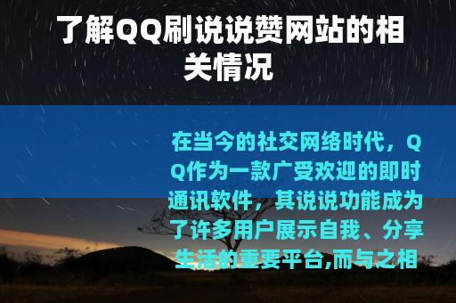 在当今的社交网络时代,QQ作为一款广受欢迎的即时通讯软件,其说说功能成为了许多用户展示自我、分享生活的重要平台,而与之相关的QQ刷说说赞网站也逐渐进入了人们的视野。