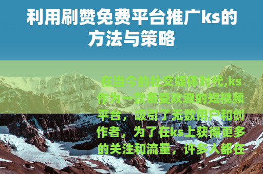 在当今的社交媒体时代,ks作为一款备受欢迎的短视频平台,吸引了无数用户和创作者,为了在ks上获得更多的关注和流量,许多人都在寻找有效的推广方法,刷赞免费平台成为了一些人关注的途径。