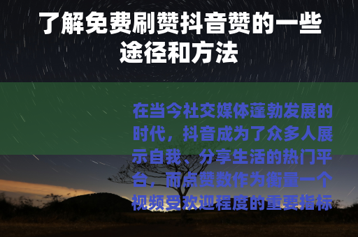 在当今社交媒体蓬勃发展的时代,抖音成为了众多人展示自我、分享生活的热门平台,而点赞数作为衡量一个视频受欢迎程度的重要指标之一,备受用户关注,免费刷赞抖音赞也成为了一些人想要了解的领域。