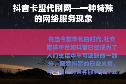 在当今数字化的时代,社交媒体平台如抖音已经成为了人们生活中不可或缺的一部分,随着抖音的日益火爆,与之相关的各种服务和产业也应运而生,其中抖音卡盟代刷网就是一个备受关注的领域。