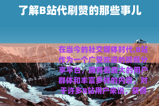 在当今的社交媒体时代,B站作为一个广受欢迎的视频分享平台,拥有着庞大的用户群体和丰富多样的内容,对于许多B站用户来说,获得更多的点赞是他们所期望的,因为这不仅可以增加视频的曝光度,还能带来一定的成就感,而“b站代刷赞”这个现象也随之应运而生。